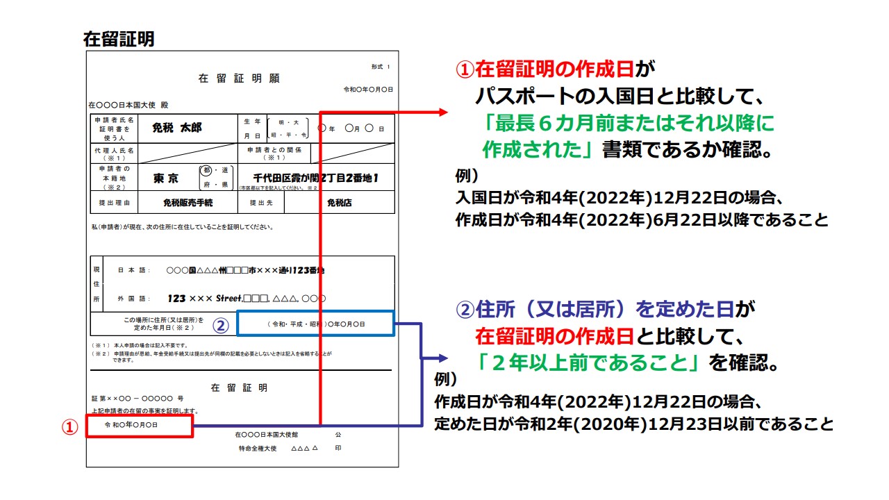 ・上記の必要書類が提出できない場合には在外公館では免税用の在留証明の申請ができませんので、日本国内の市区町村役場等で取得できる本籍地が記載された「戸籍の附票の写し」をご利用ください。【免税制度についてのご質問】 hqt-taxfree@mlit.go.jp