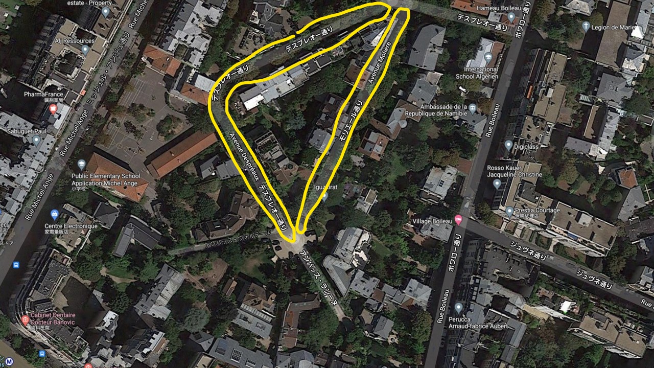 黄色で囲った道は「Avenue」とされています。決して表通りじゃない住宅街です。