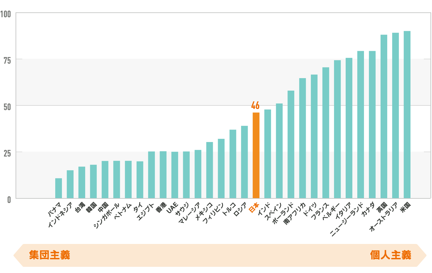 異文化理解のフレームワーク「ホフステードの6次元モデル」(2)アイデンティティ:集団主義/個人主義 (hofstede.jp)からの引用です。