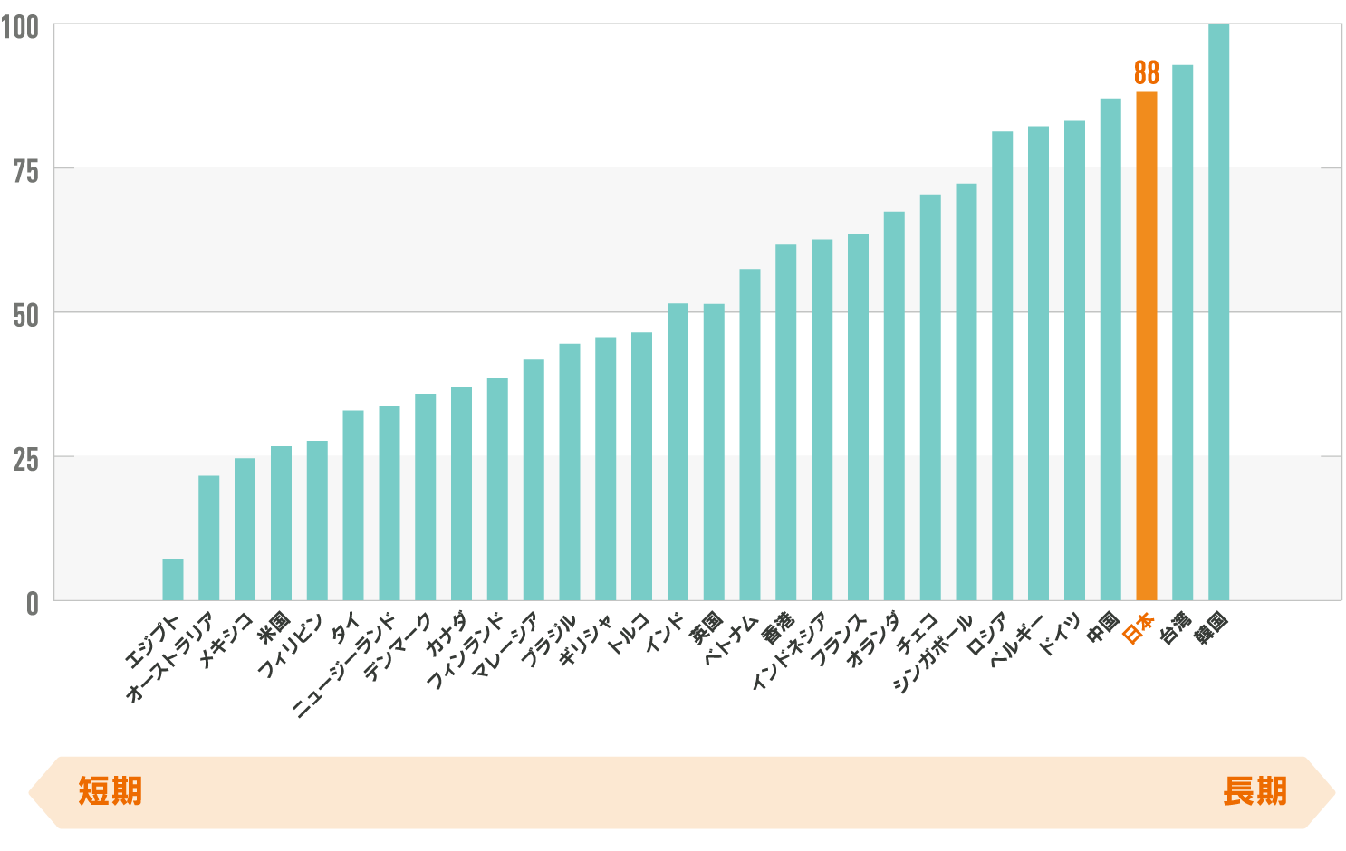 異文化理解のフレームワーク「ホフステードの6次元モデル」(5)今すぐ結果を求めるのか、先を見据えて投資するのか:短期志向/長期志向 (hofstede.jp)からの引用です。