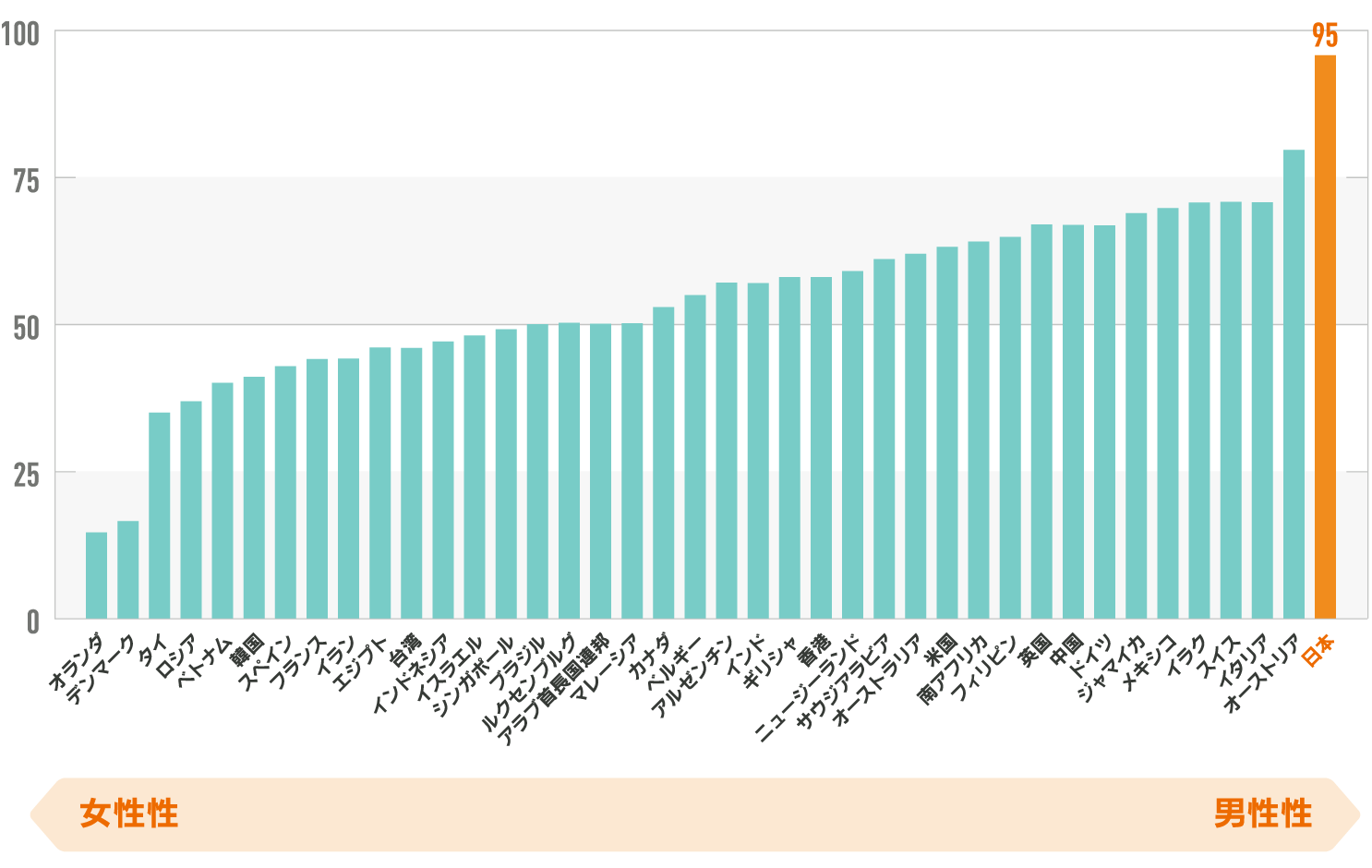 男性性が強い傾向の社会(スコア55 – 100)では、社会的に成功することが重視されます。設定された目標は必ず達成すべきものであり、絶え間ない努力が求められ、その結果成功した者は周りの人々から賞賛されます。また、男女の社会的役割を区別しようとする傾向があり、「男らしい」「女らしい」という表現でものごとを解釈することが多々あります。