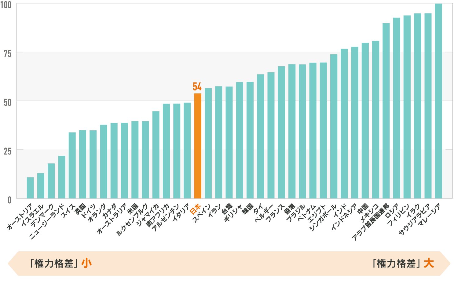 『権力格差は、パワーの弱い人の価値に基づき、子供(家庭)、生徒(学校)、部下(組織)など、パワーを持たない人たちが、親、教師、上司など、権力を持っている人たちとの間に横たわる不平等、距離をどう受け止めるのかを示します。』