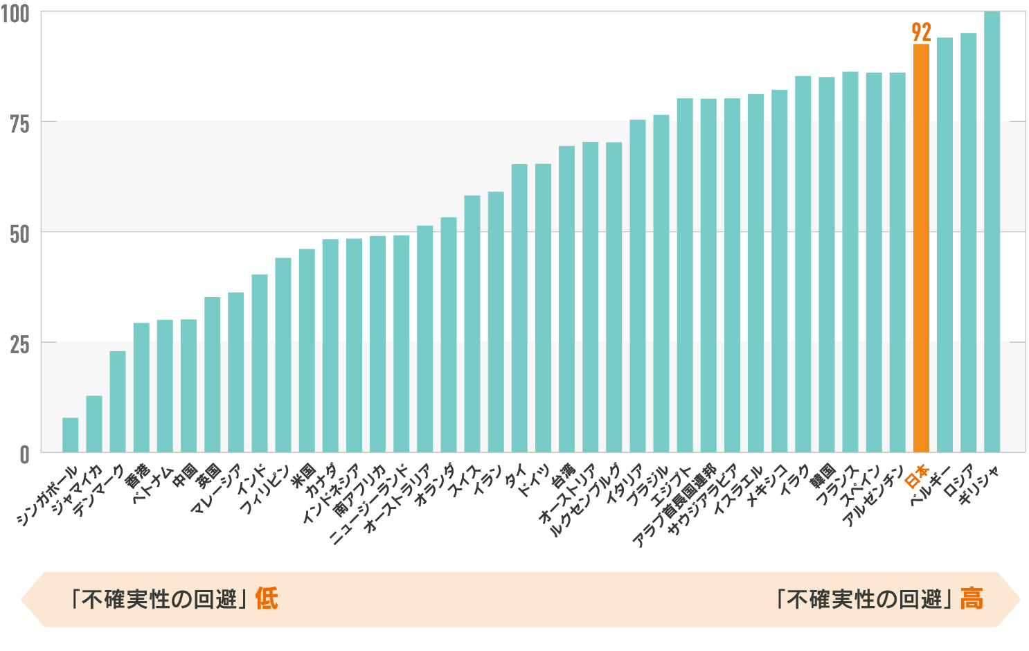 「未来に何が起こるのかわからない」というあいまいで未知、予測不可能な状況に不安と脅威を覚え、ストレスにさらされることを回避しようとする次元を「不確実性の回避:ある文化の成員が不確実な、未知の状況に対して不安を感じ、それを避けるために信仰や制度を形成している程度*1」といいます。